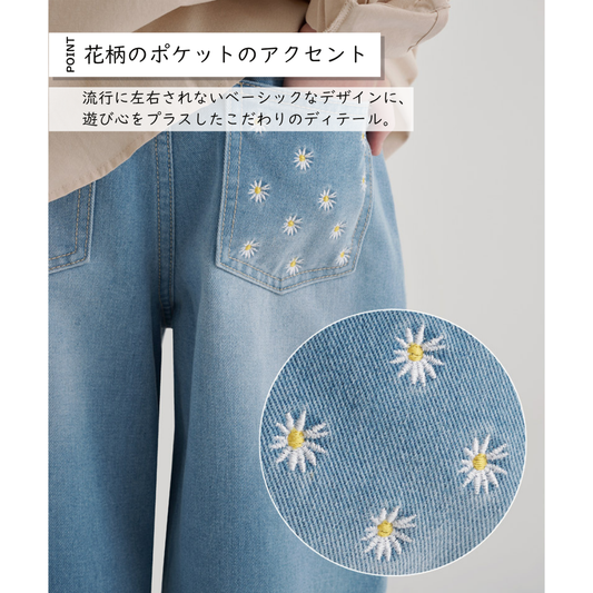 売り切れ花柄 ワンポイント ロングデニムパンツ
